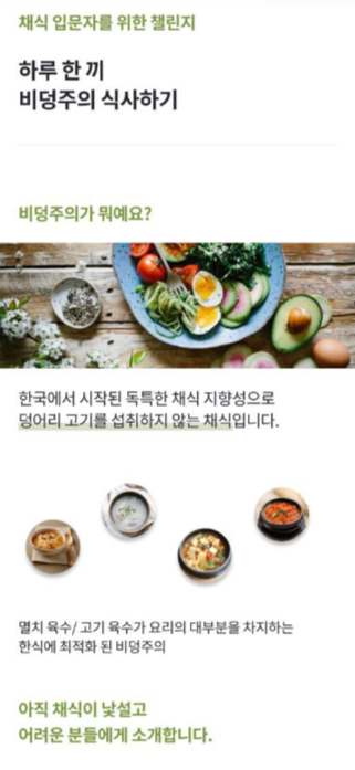 뭐라도 해야겠다는 결심을 하자마자 이 챌린지가 떠올랐다. 챌린저스에는 생태계를 지키기 위한 몇 가지 챌린지가 있는데 그중 하나가 <하루 한 끼 비덩주의 식사하기>다. 텀블러나 천연수세미 쓰기, 플라스틱 빨대 사용 자제 등은 쉽게 할 수 있겠는데 이건 식단에 손을 대는 거라 내 일이 아니라고 생각했건만...