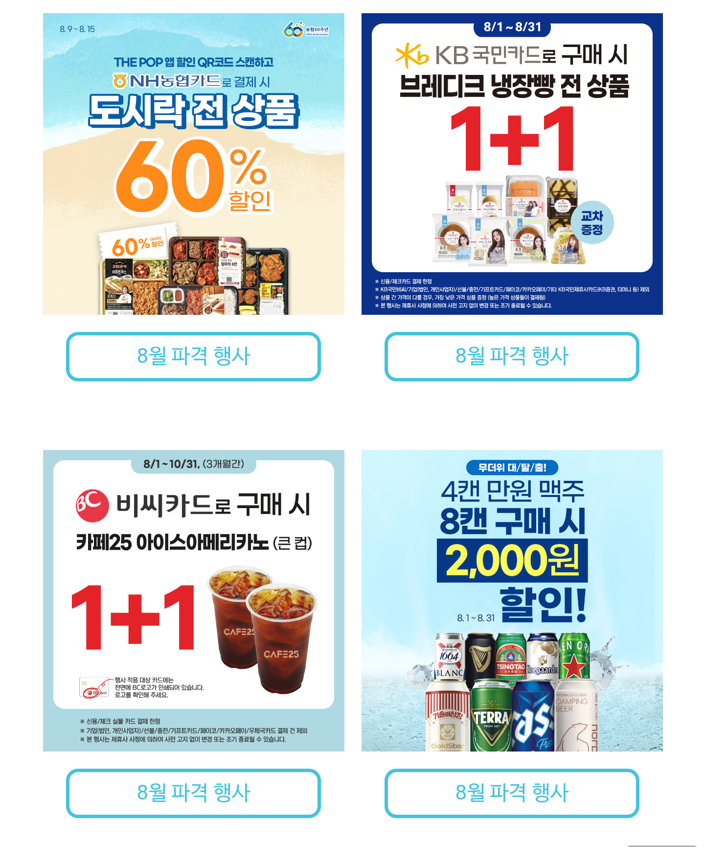 8월 9일부터 8월 15일까지: NH농협카드로 결제 시 도시락 전 상품 60% 할인! (THEPOP 앱도 있어야 함)