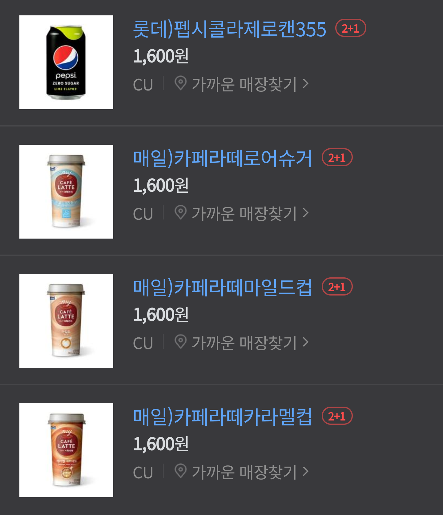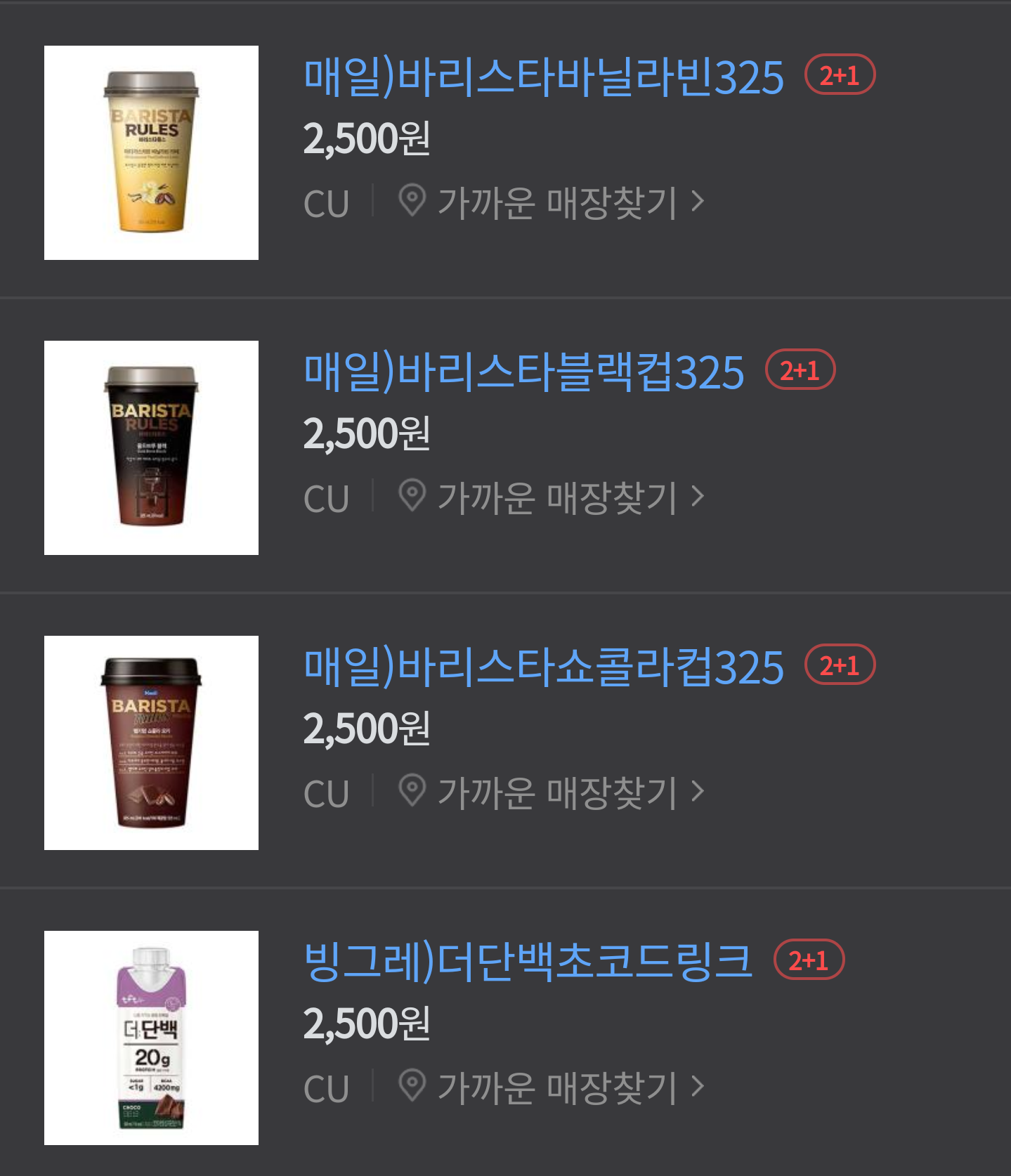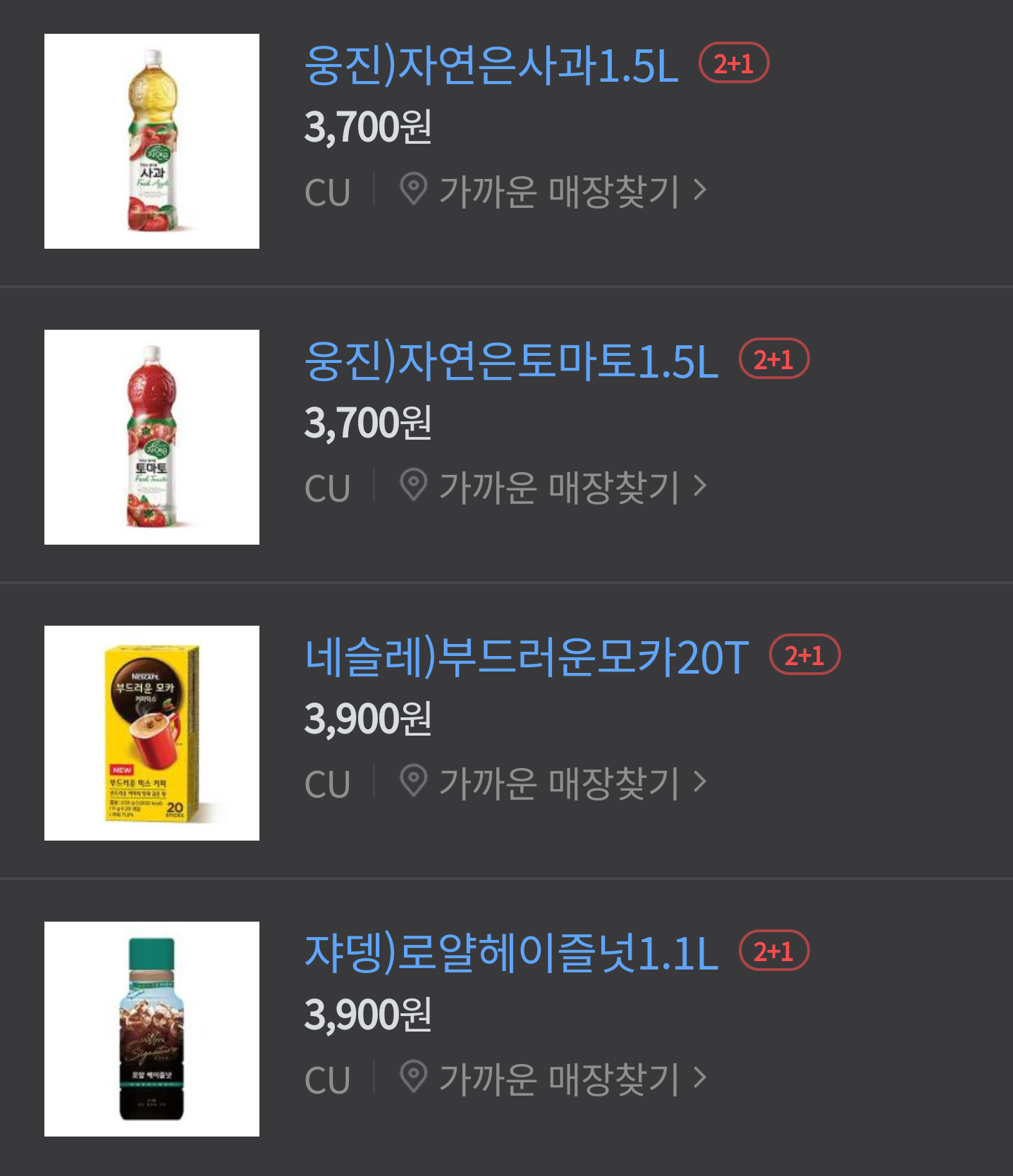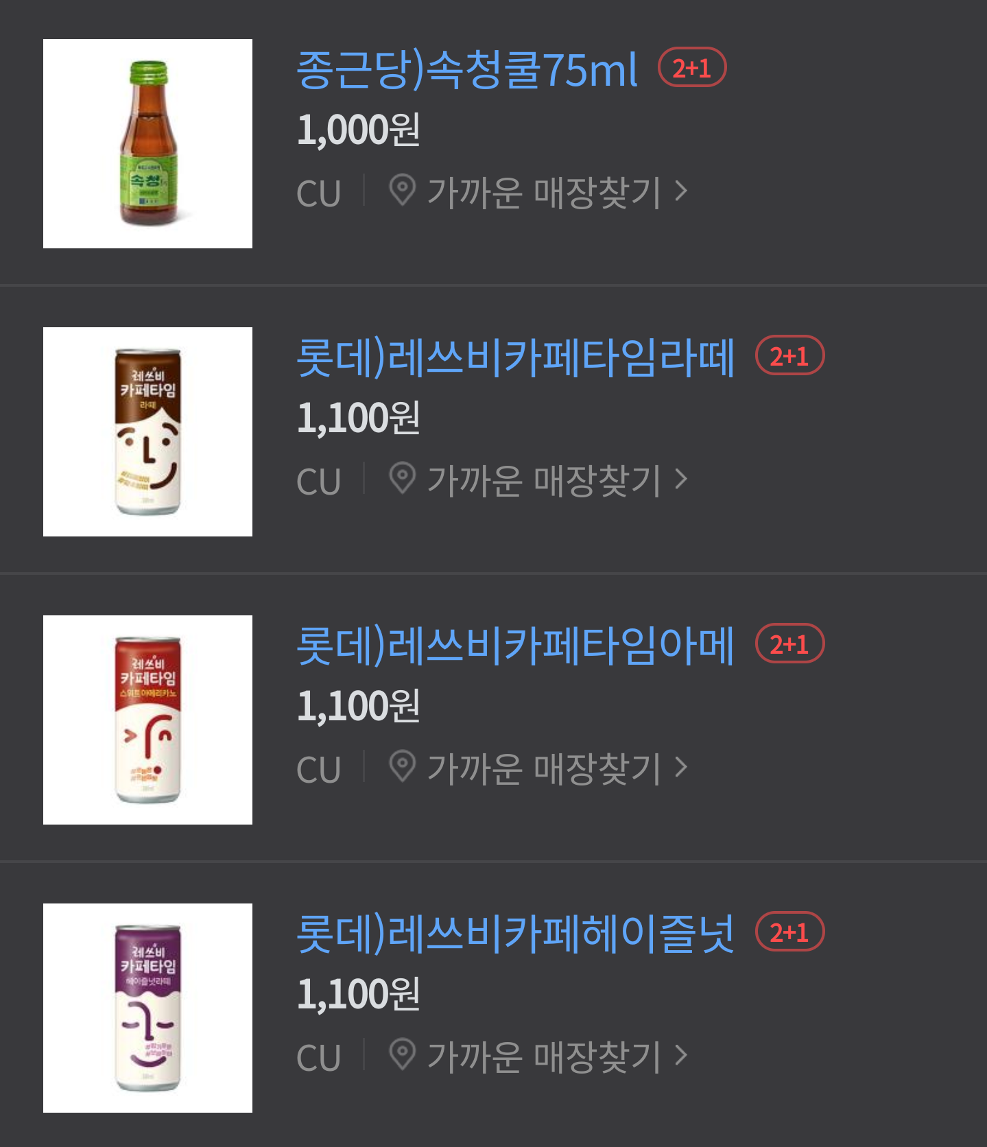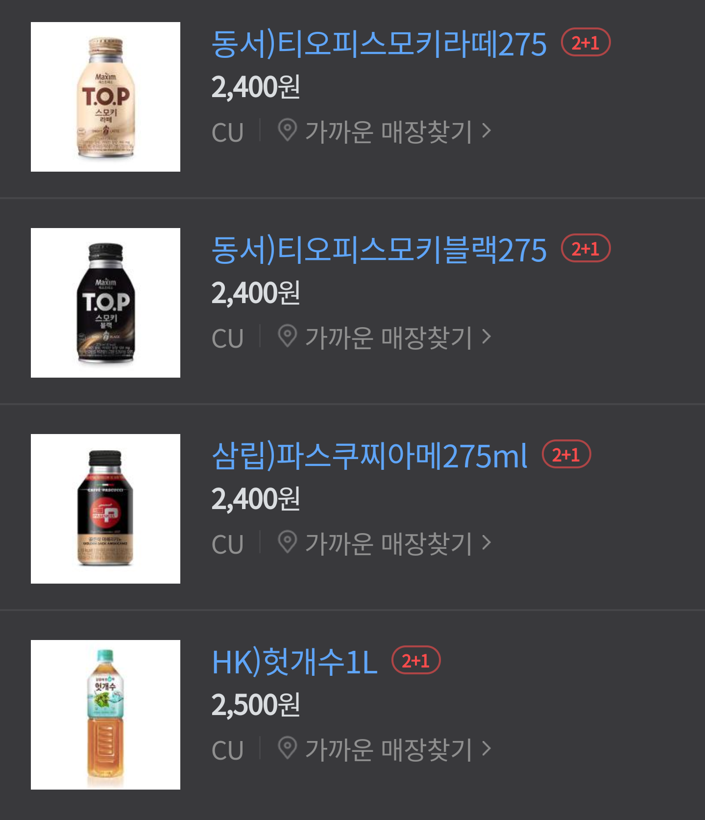 더 많은 2+1 상품(음료, 간식 종류만)은 아래 더보기 클릭