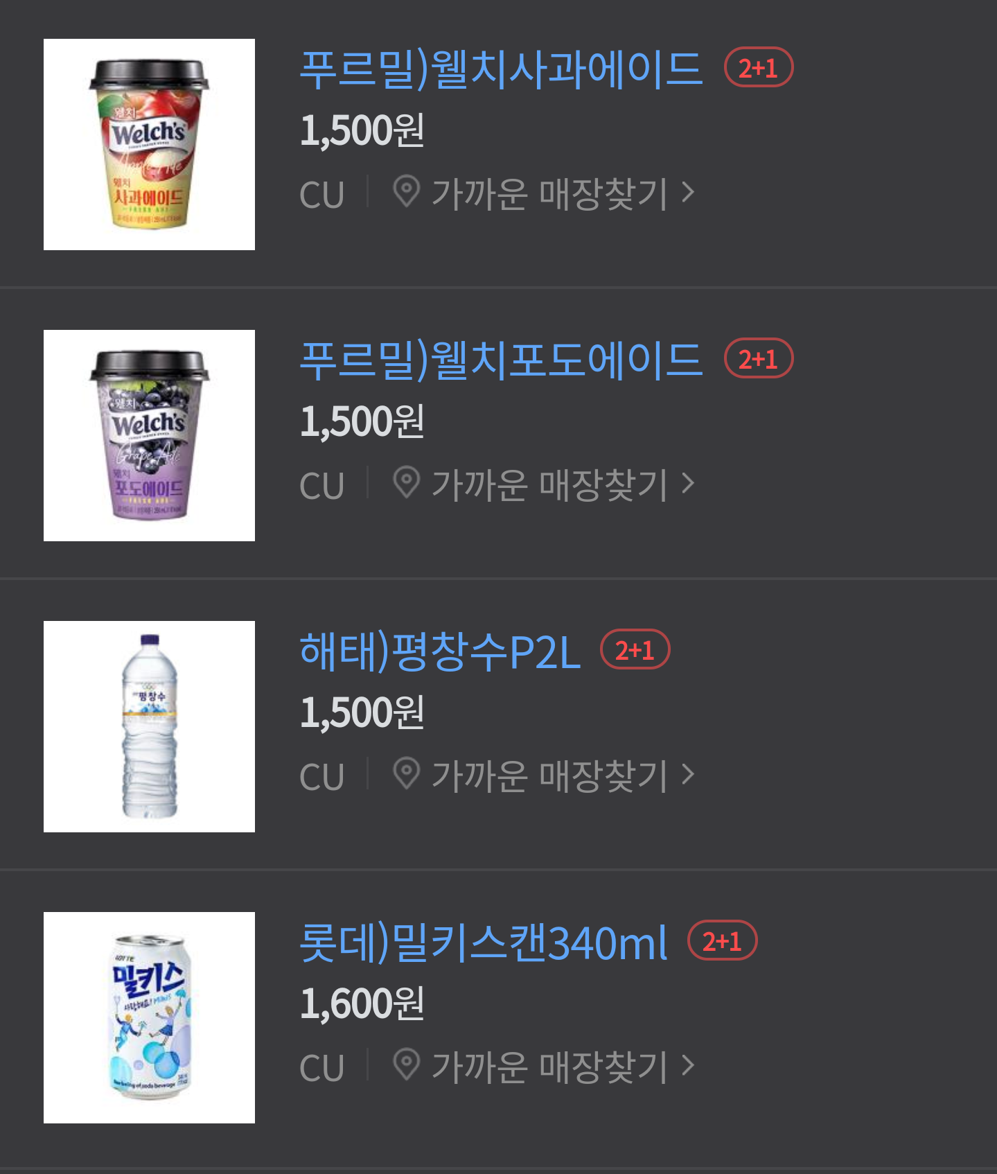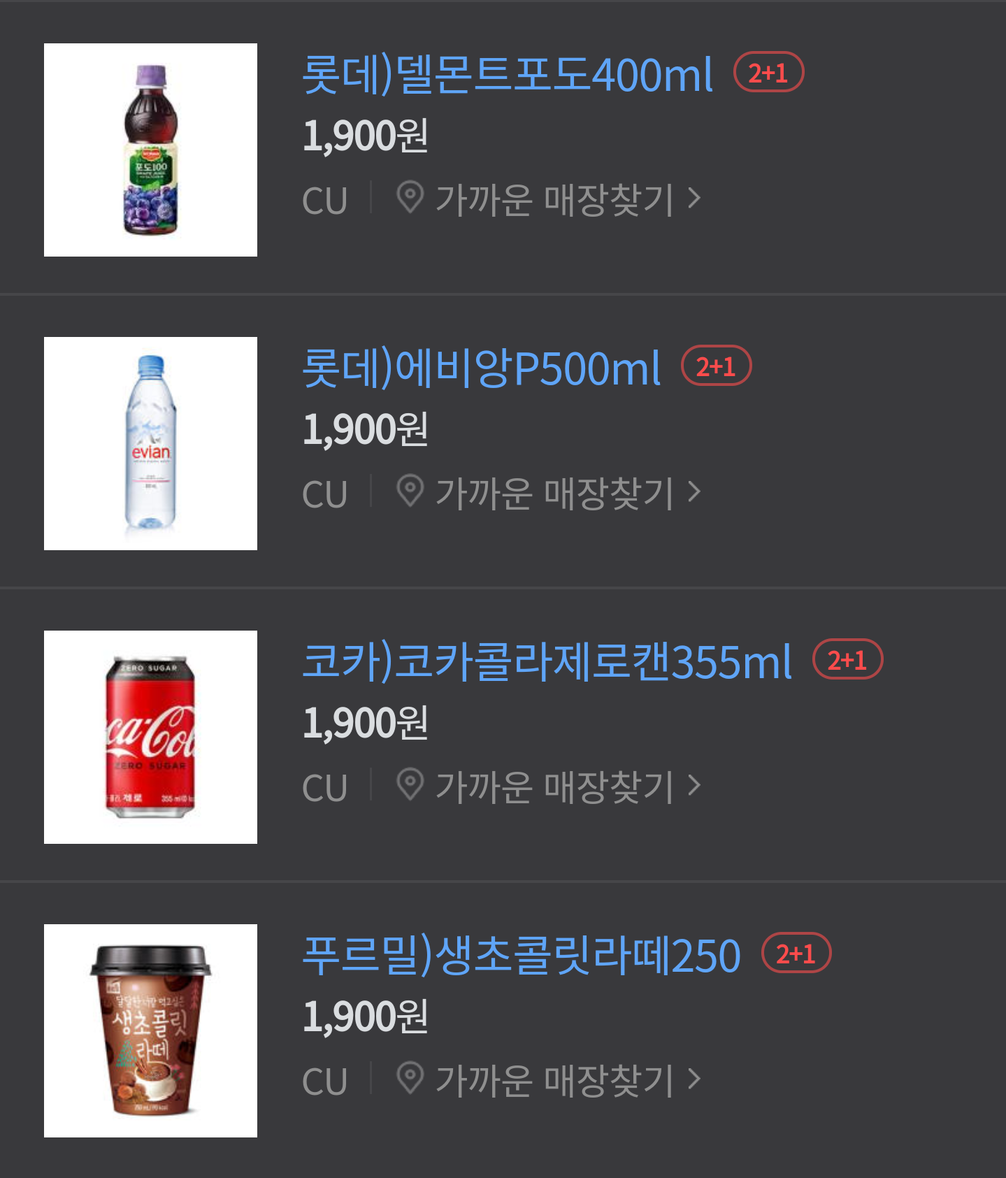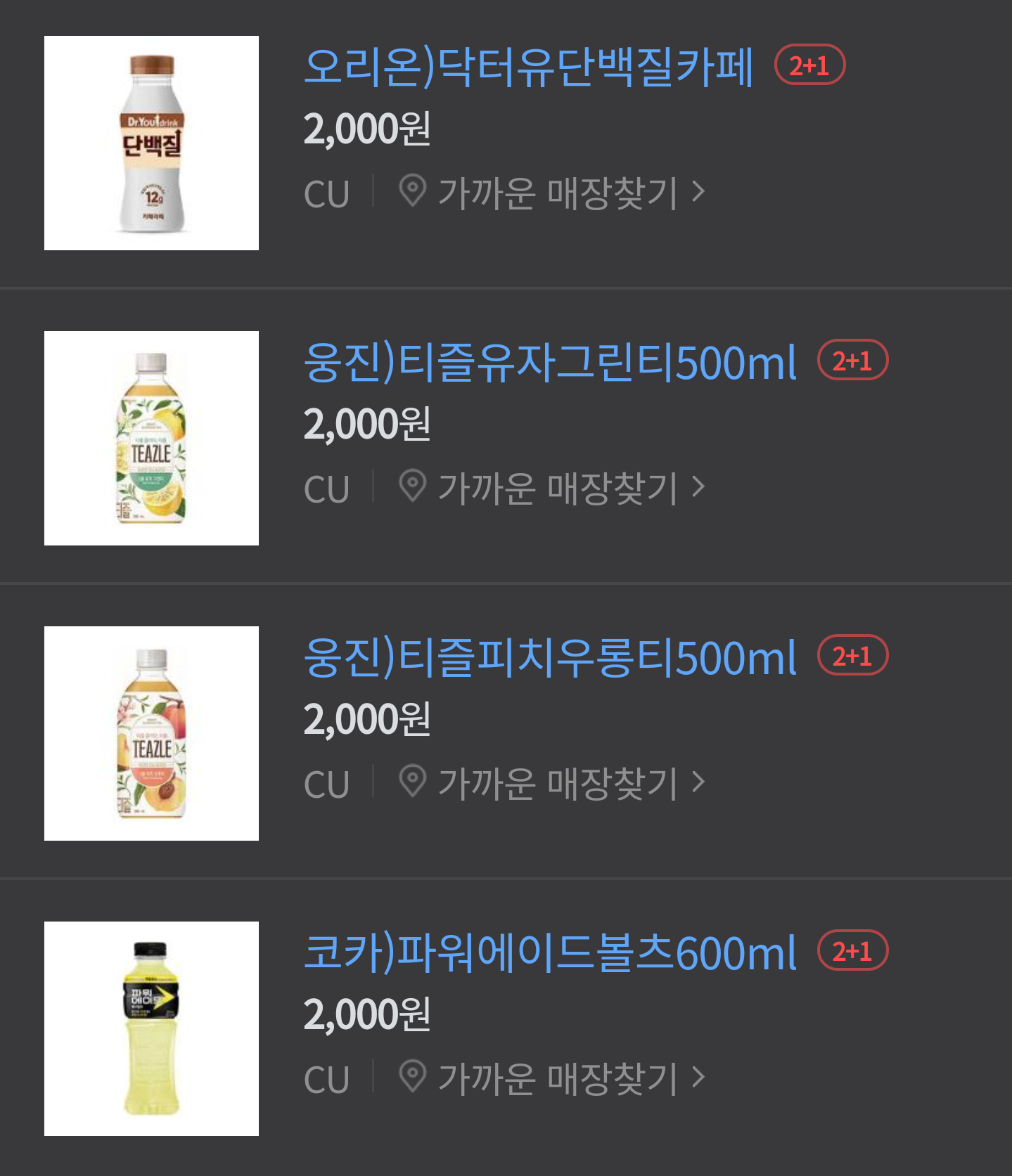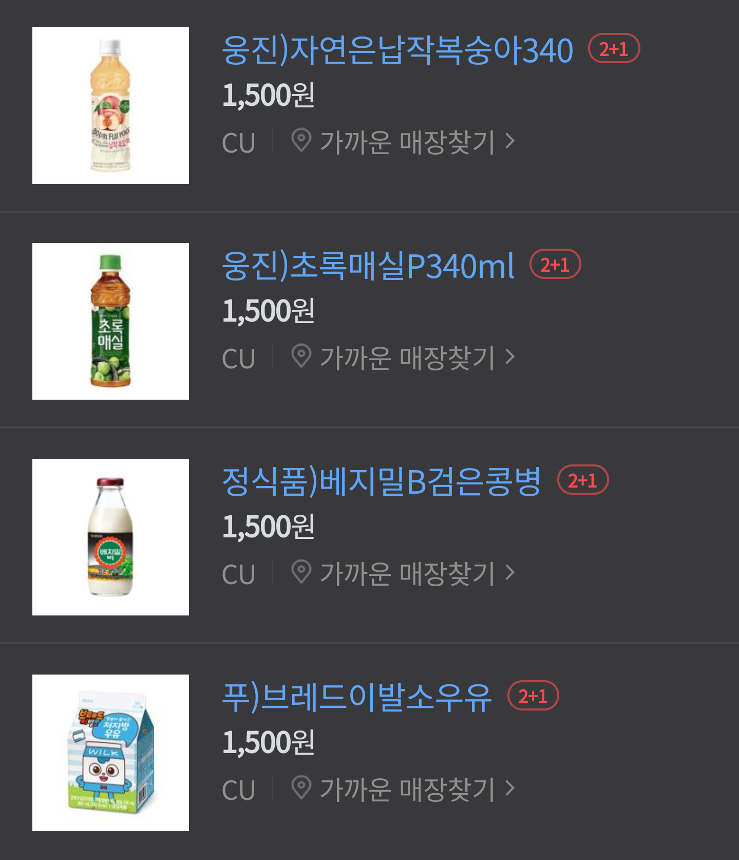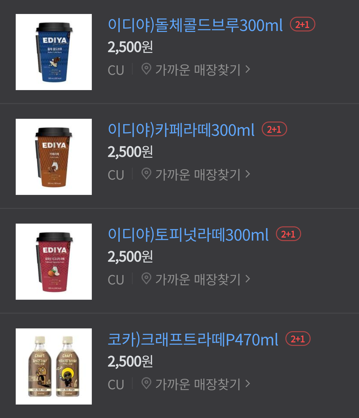 더 많은 2+1 상품(음료, 간식 종류만)은 아래 더보기 클릭