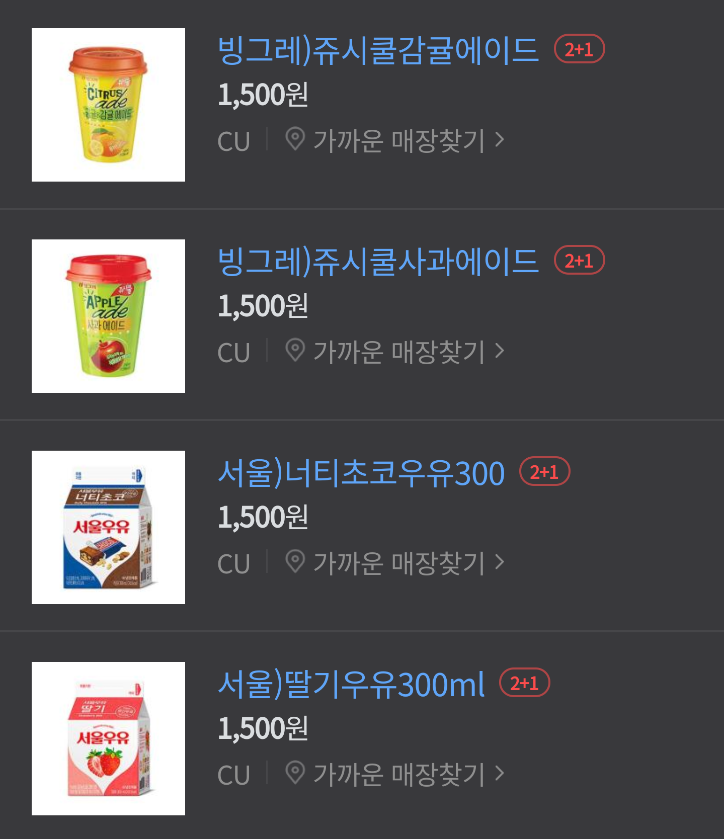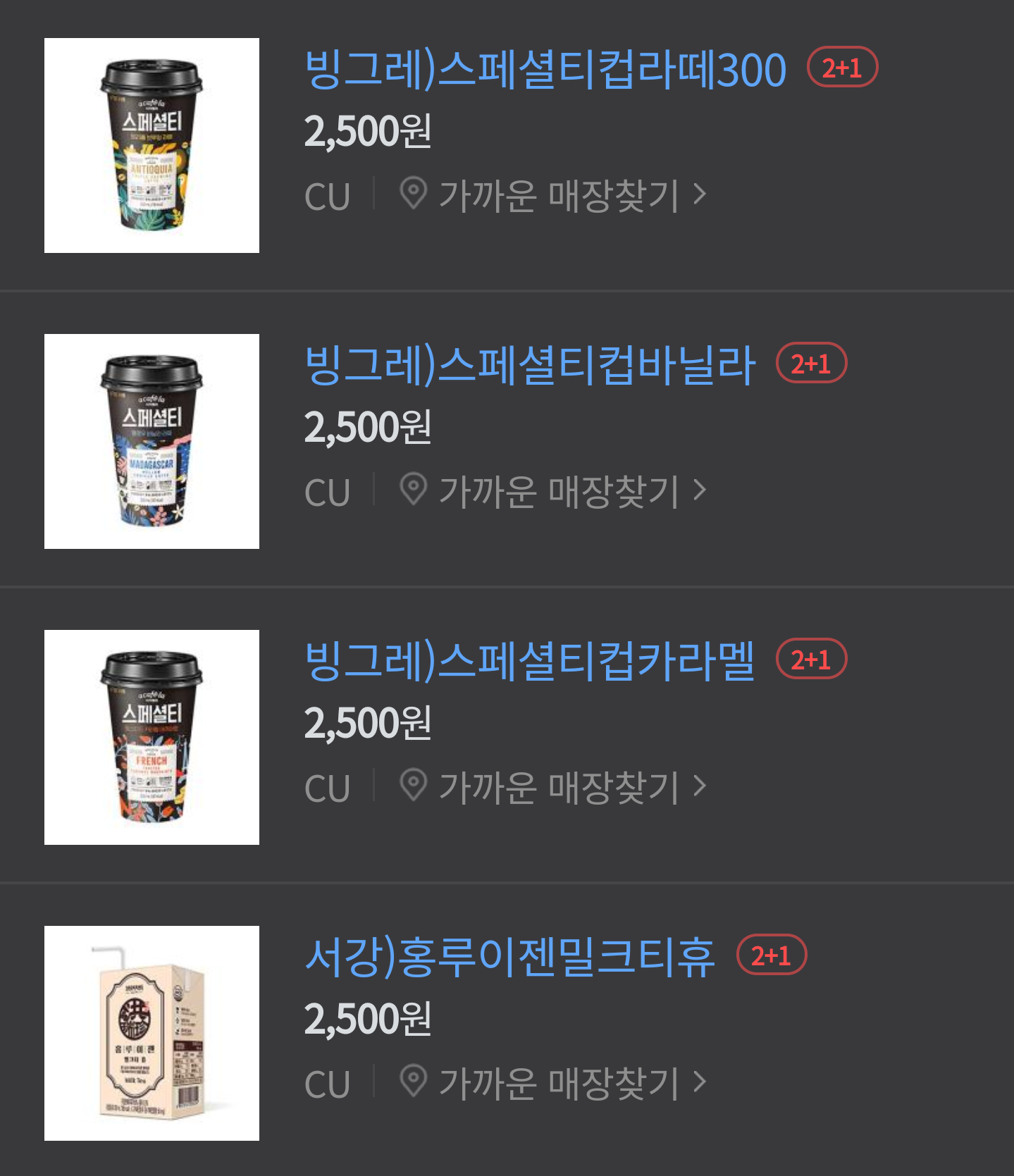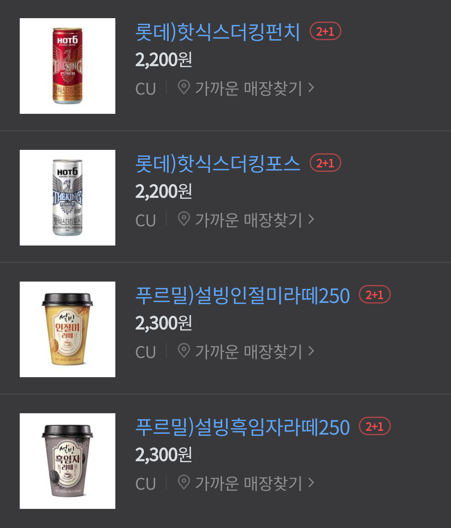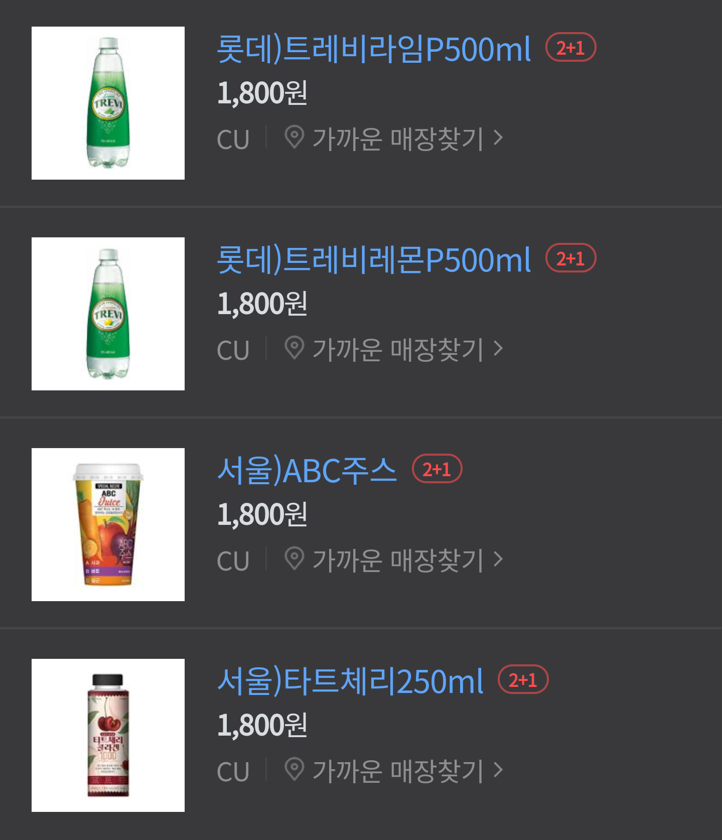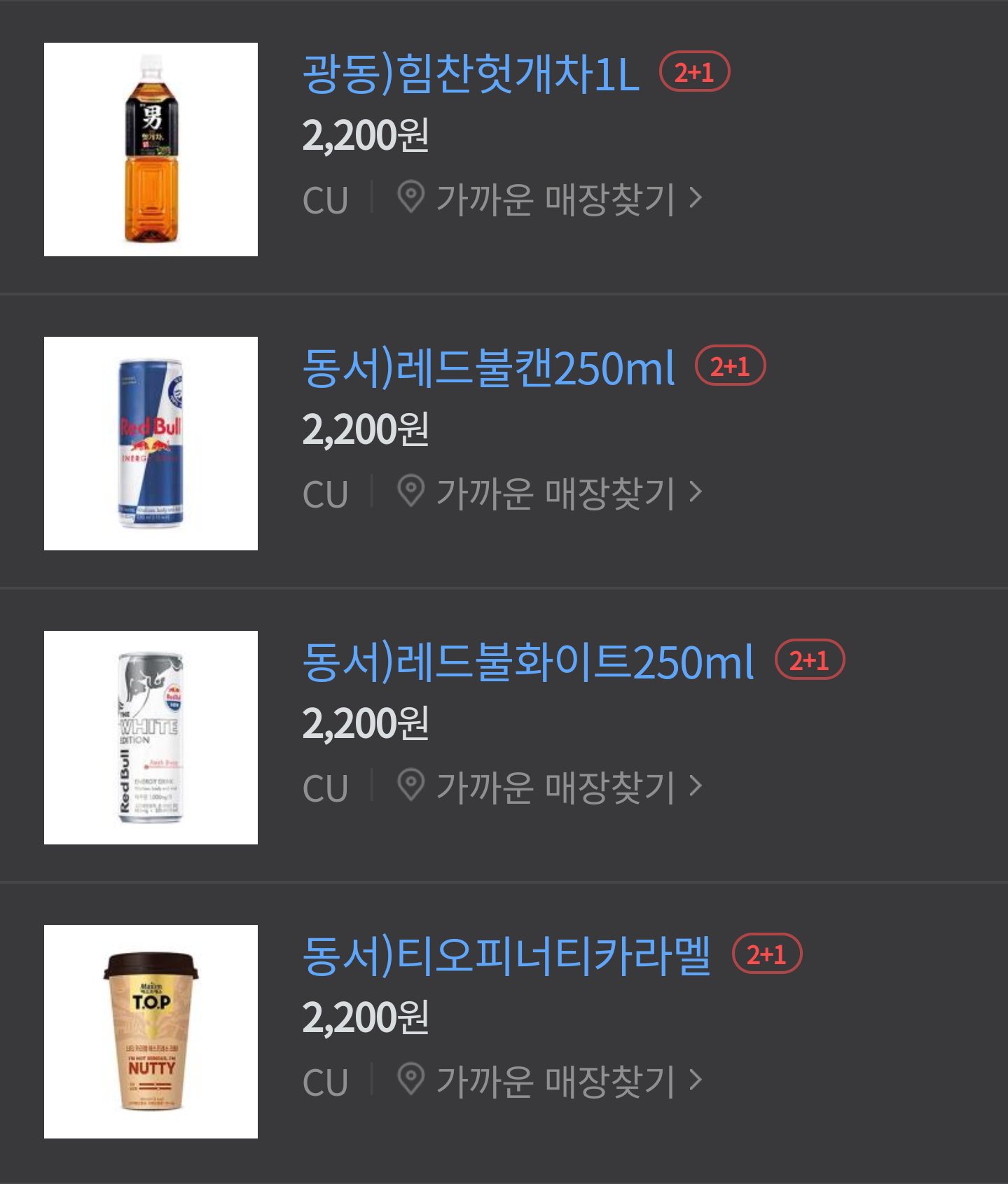 더 많은 2+1 상품(음료, 간식 종류만)은 아래 더보기 클릭