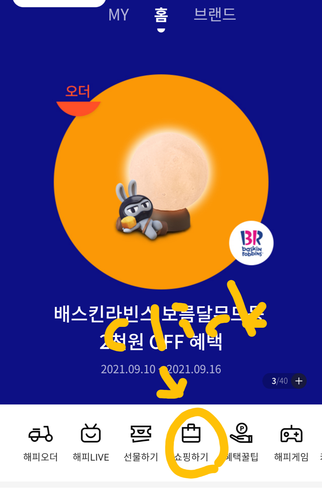 해피포인트 어플 메인에서 '쇼핑하기' 클릭.