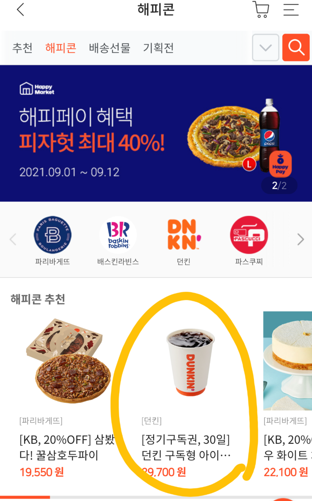 내가 살 때는 쇼핑하기 메인에 바로 떴는데, 지금은 '해피콘' 클릭해야 '해피콘 추천'으로 나옴.