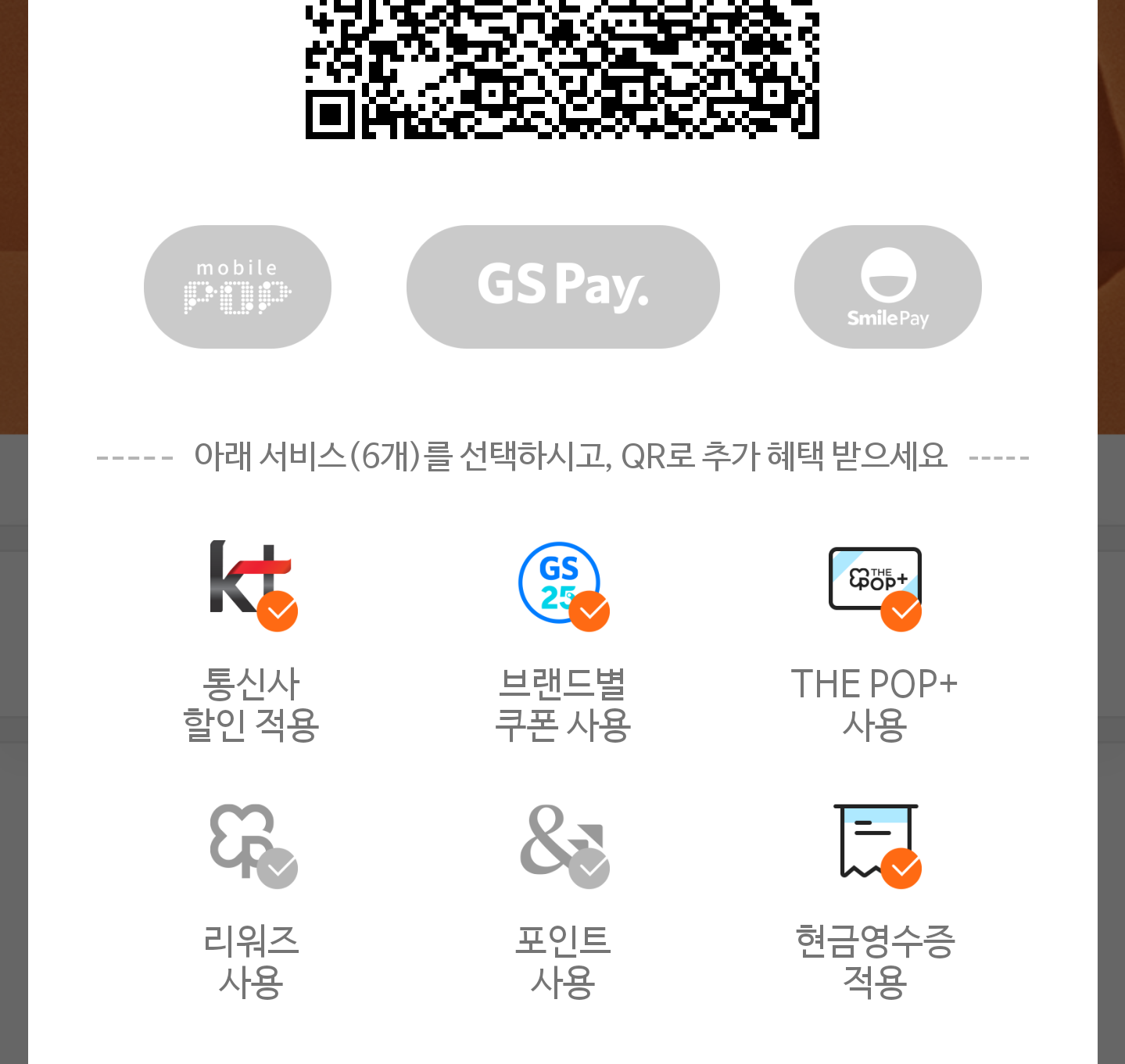 큐알코드만 찍으면 통신사 할인, 더팝플러스 할인, 현금영수증, GS포인트 적립까지 완료!